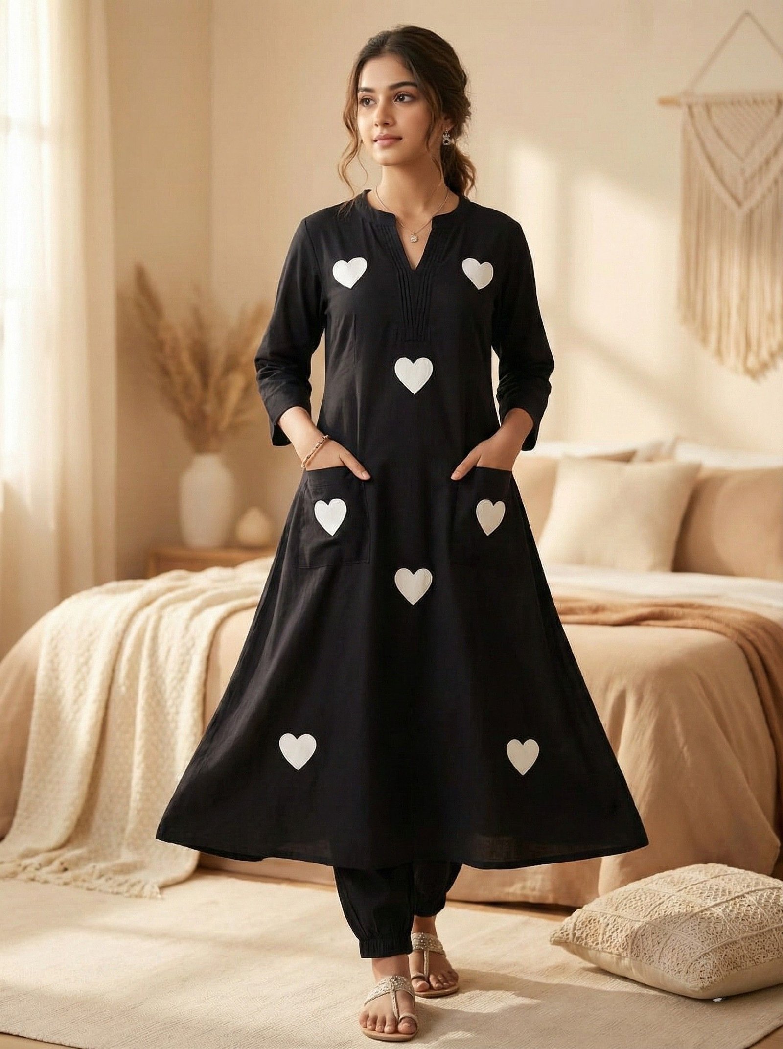 Product Overview: Elevate your casual wardrobe with this stylish Black Kurta and Pant set. Crafted from soft, breathable fabric, the kurta features a smart notched neckline, 3/4th sleeves, and a flattering A-line silhouette. The standout features are the contrasting white heart appliqués and dual front patch pockets, adding a unique touch to a classic look. The set comes complete with matching solid black bottoms featuring elasticated ankle cuffs for a contemporary fit.